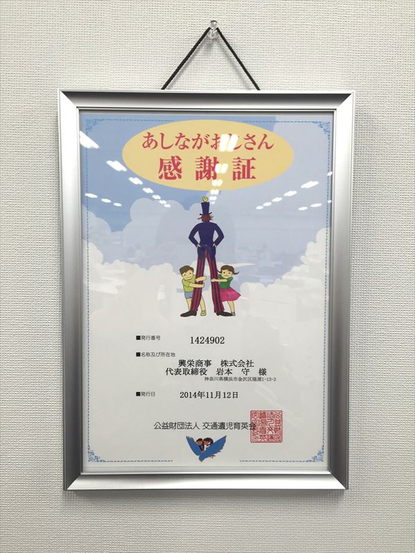交通遺児育英会より「あしながおじさん感謝証」を頂きました。