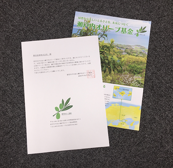 NPO法人瀬戸内オリーブ基金からお礼状をいただきました。