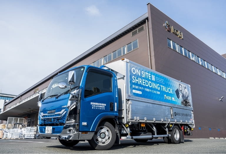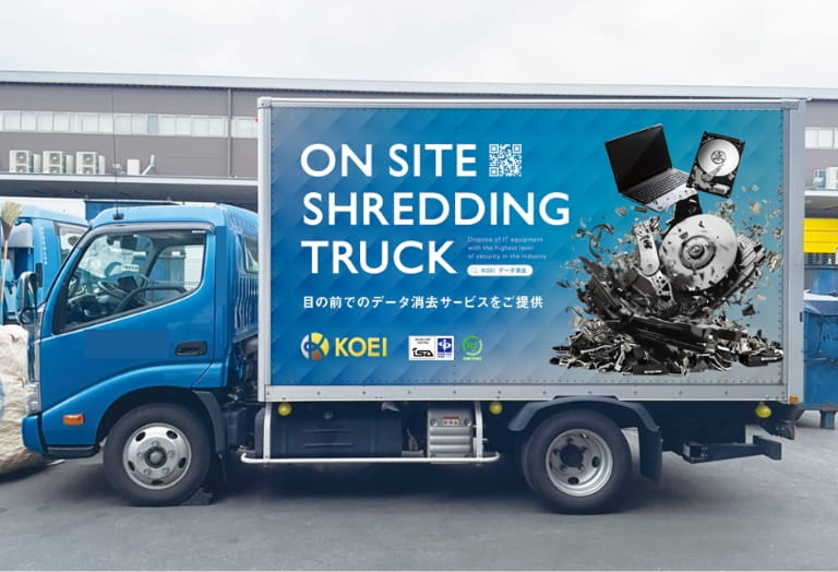 KOEI JAPANでは「On-Site Shredding:オンサイトシュレッディングサービス」と呼ばれる最も安全なデータ消去方法の1つであるノウハウを有しております。