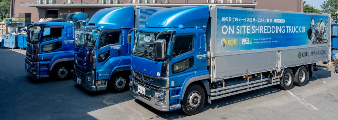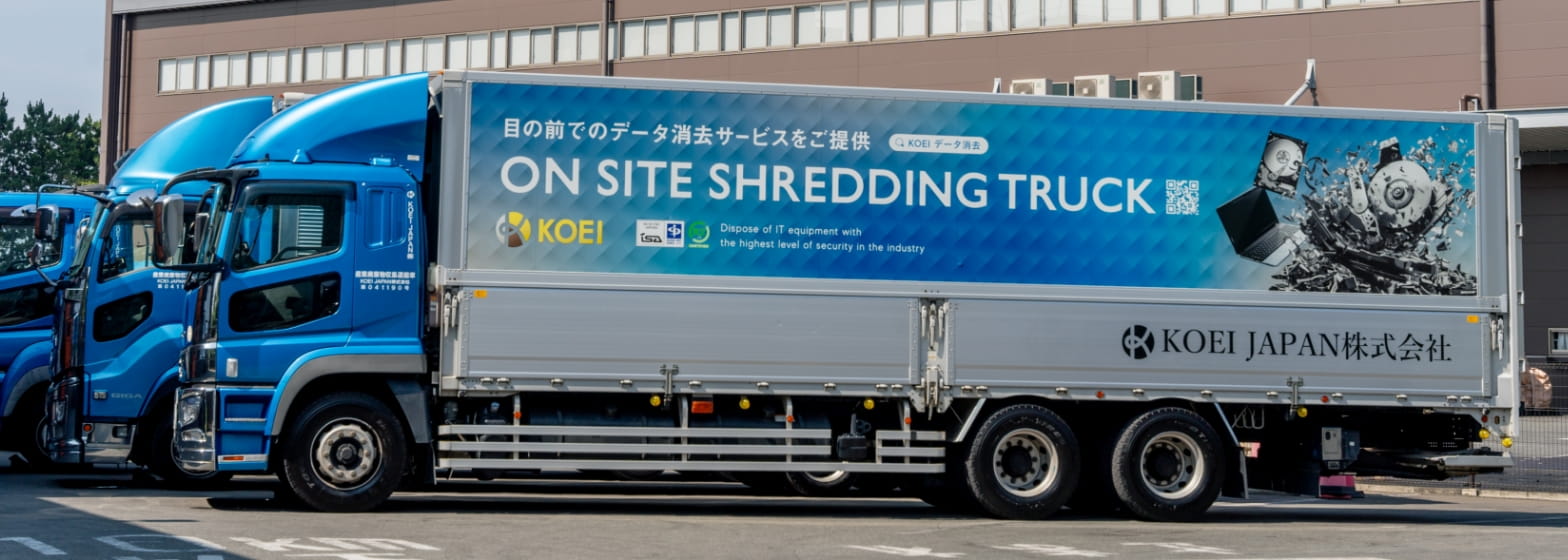 KOEI JAPANでは「On-Site Shredding:オンサイトシュレッディングサービス」と呼ばれる最も安全なデータ消去方法の1つであるノウハウを有しております。