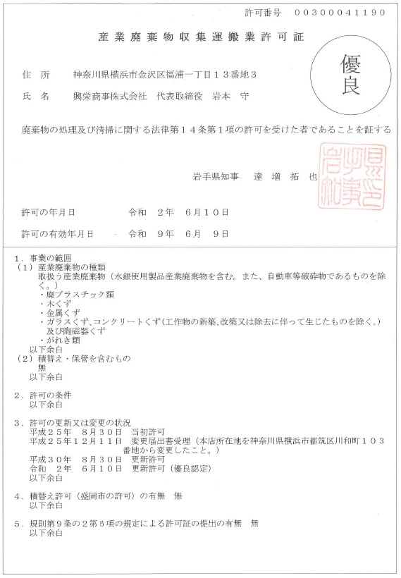 2020年6月10日、興栄商事が産業廃棄物収集運搬業(岩手県)の許可において優良認定を受けましたことをお知らせいたします。