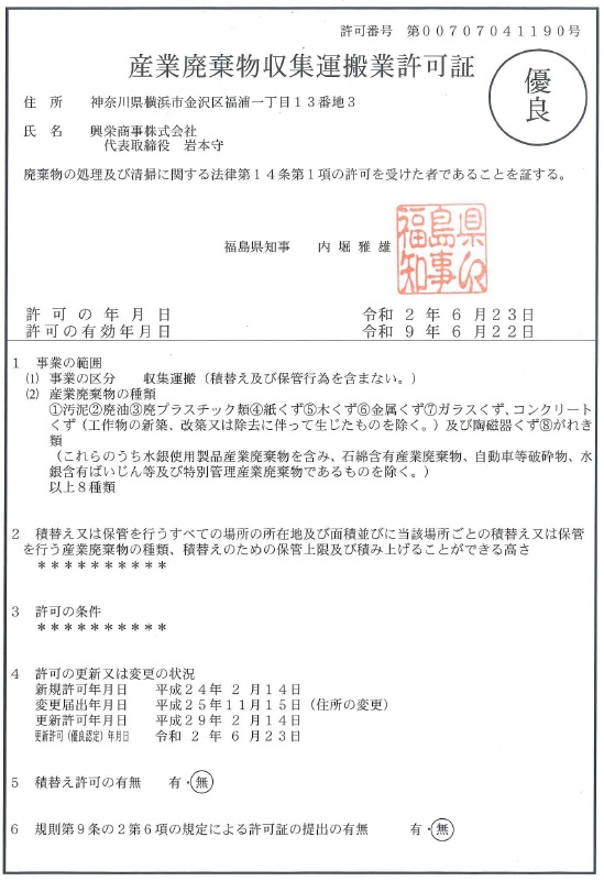 2020年6月23日、興栄商事が産業廃棄物収集運搬業(福島県)の許可において優良認定を受けましたことをお知らせいたします。