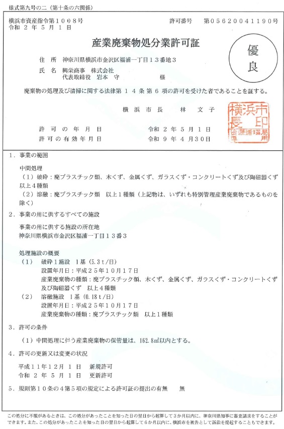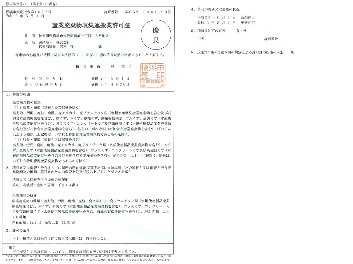 2020年5月1日、興栄商事が産業廃棄物処分業・収集運搬業(横浜市)の許可において優良認定を受けましたことをお知らせいたします。