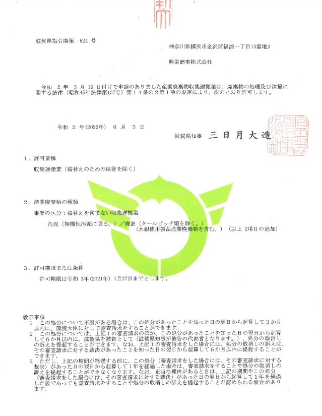 2020年6月3日、興栄商事が産業廃棄物収集運搬業(滋賀県)の許可において種別追加を致しましたことをお知らせいたします。