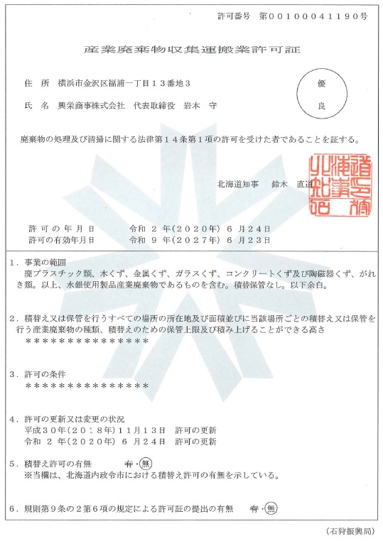 2020年6月24日、興栄商事が産業廃棄物収集運搬業(北海道)の許可において優良認定を受けましたことをお知らせいたします。