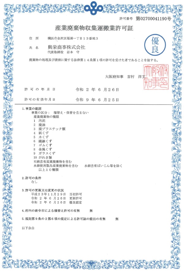 2020年6月26日、興栄商事が産業廃棄物収集運搬業(大阪府)の許可において優良認定を受けましたことをお知らせいたします。