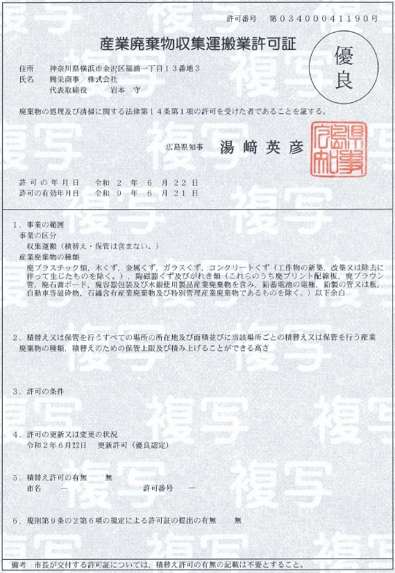 2020年6月22日、興栄商事が産業廃棄物収集運搬業(広島県)の許可において優良認定を受けましたことをお知らせいたします。