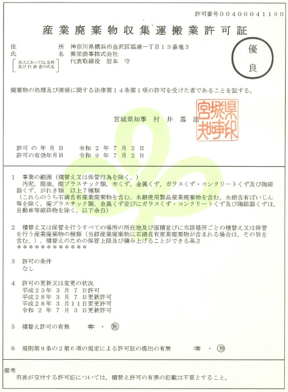 2020年7月3日、興栄商事が産業廃棄物収集運搬業(宮城県)の許可において優良認定を受けましたことをお知らせいたします。