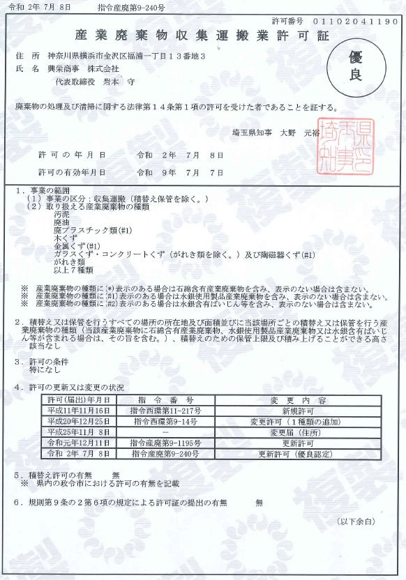 2020年7月8日、興栄商事が産業廃棄物収集運搬業(埼玉県)の許可において優良認定を受けましたことをお知らせいたします。