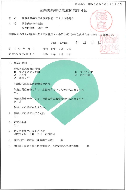 2020年7月7日、興栄商事が産業廃棄物収集運搬業(和歌山県)の許可において優良認定を受けましたことをお知らせいたします。