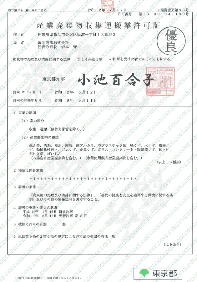 2020年6月12日、興栄商事が産業廃棄物収集運搬業(東京都)の許可において優良認定を受けましたことをお知らせいたします。