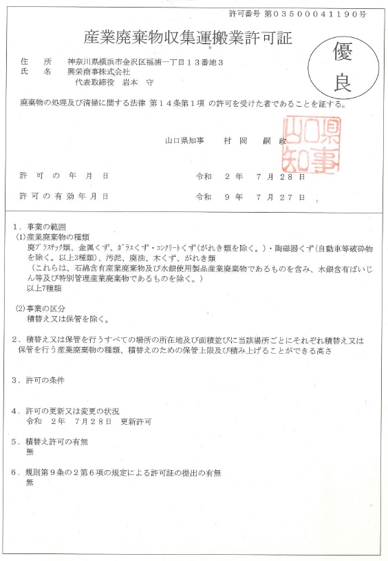 2020年7月28日、興栄商事が産業廃棄物収集運搬業(山口県)の許可において優良認定を受けましたことをお知らせいたします。