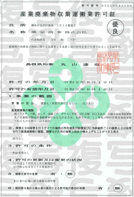 2020年8月19日、興栄商事が産業廃棄物収集運搬業(島根県)の許可において優良認定を受けましたことをお知らせいたします。
