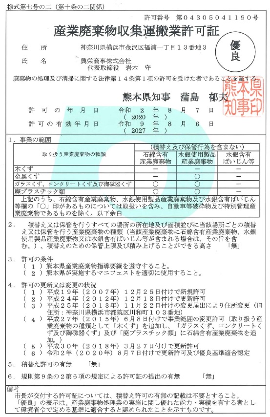 2020年8月7日、興栄商事が産業廃棄物収集運搬業(熊本県)の許可において優良認定を受けましたことをお知らせいたします。