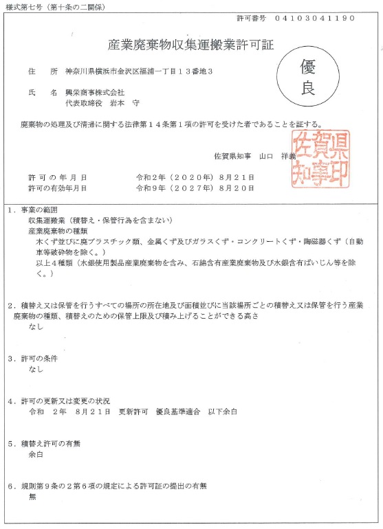 2020年8月21日、興栄商事が産業廃棄物収集運搬業(佐賀県)の許可において優良認定を受けましたことをお知らせいたします。