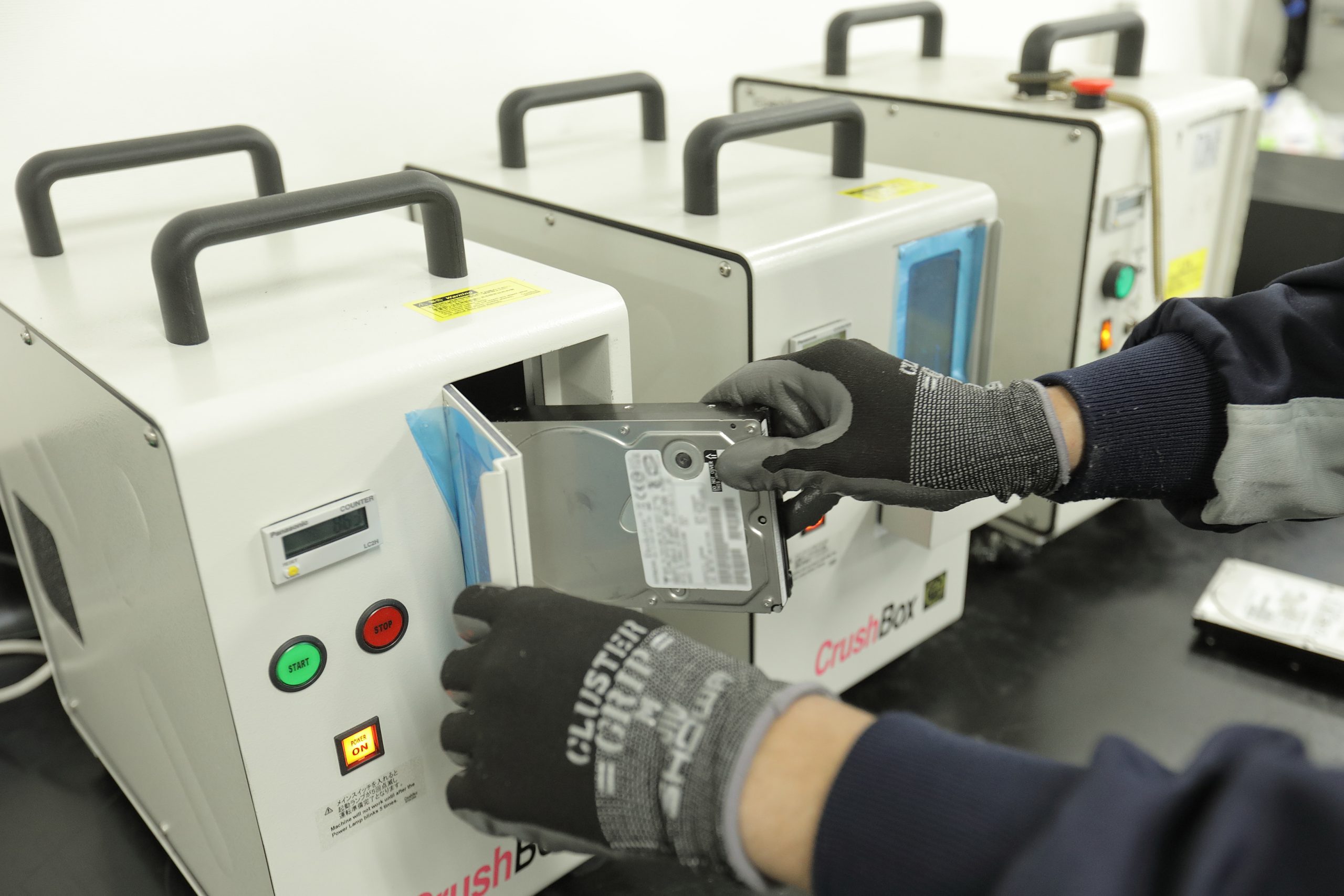 そのため興栄商事では専門のデータ消去ツールを使用しているほか、機械による「物理的な」破壊も行っています。