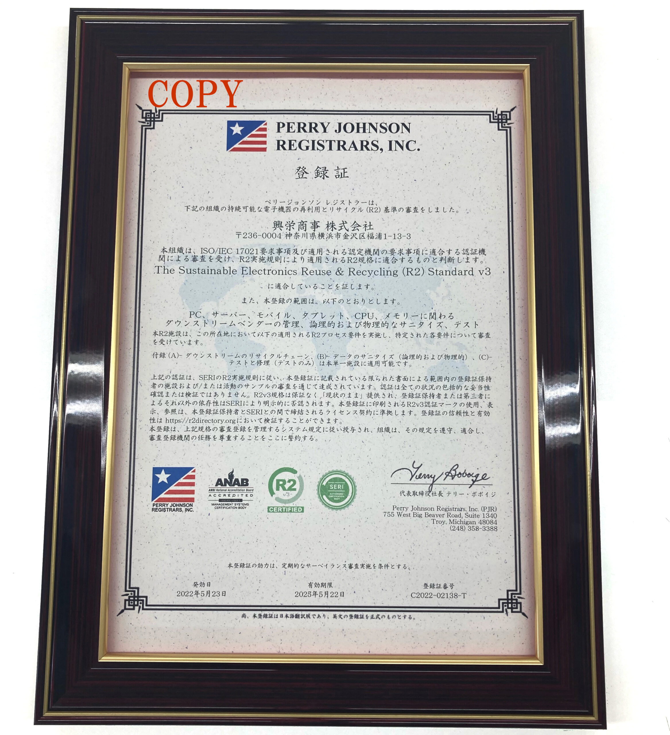 2022年5月23日、興栄商事は厳格な審査を通過し、R2(Responsible Recycling=責任あるリサイクル)認証を取得しました。