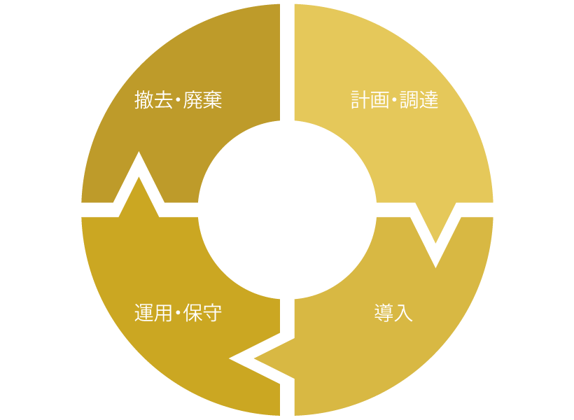 ライフサイクルマネジメントとは、法人パソコンの調達・導入から、運用、保守、利用終了後の廃棄などの一連のサイクルに対して、PC導入による業務効率の最大化や、ライフサイクル全般におけるコストの最適化などの観点から計画を練って管理する考え方です。