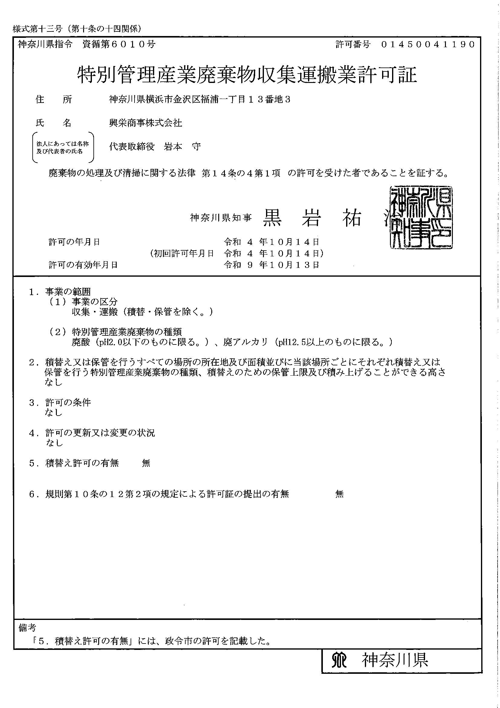 ①神奈川県 特別管理産業廃棄物(品目:廃酸・廃アルカリ)の収集運搬業の許可