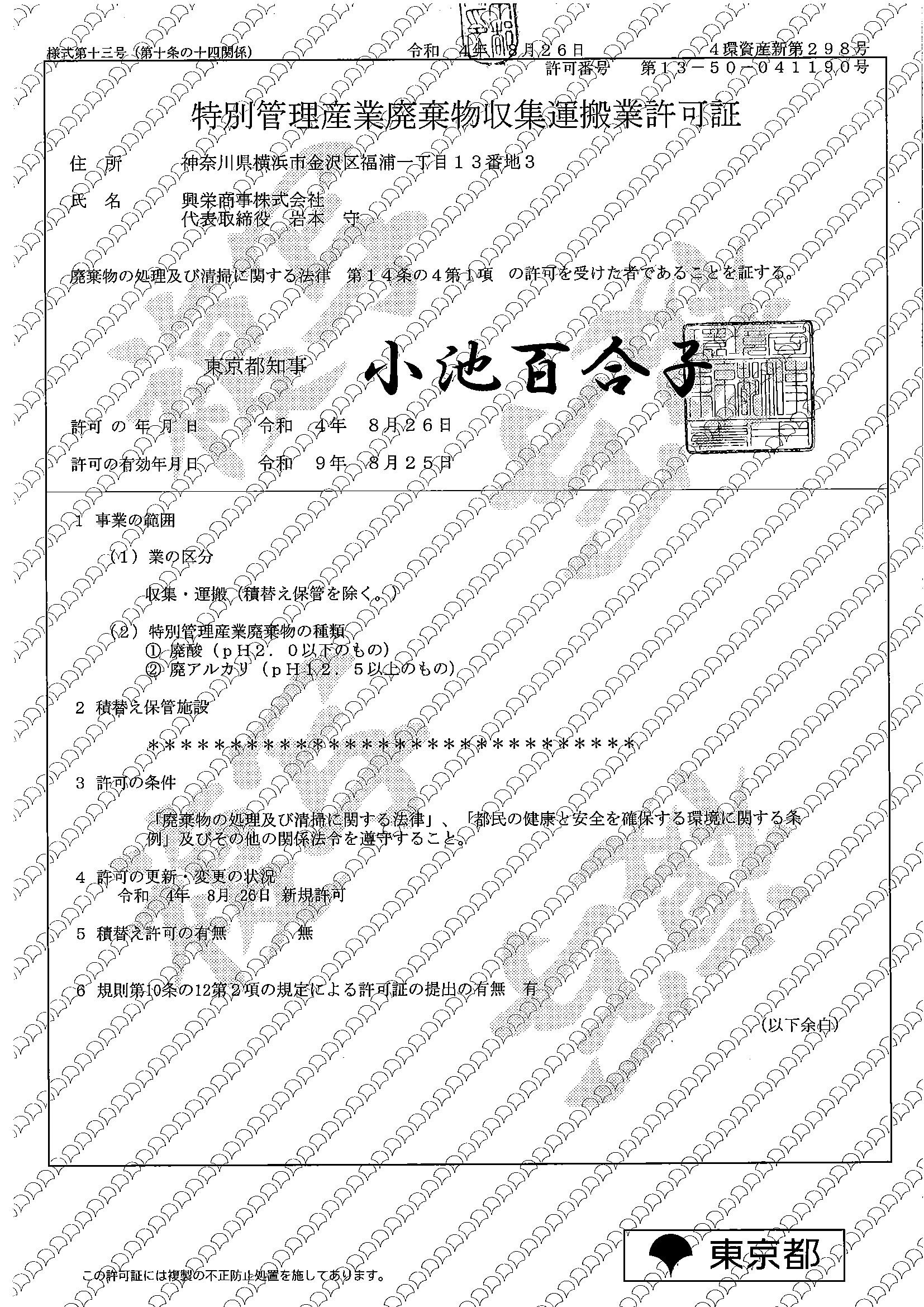 このたび興栄商事は、下記の通り特別管理産業廃棄物収集運搬の許可を取得しました。