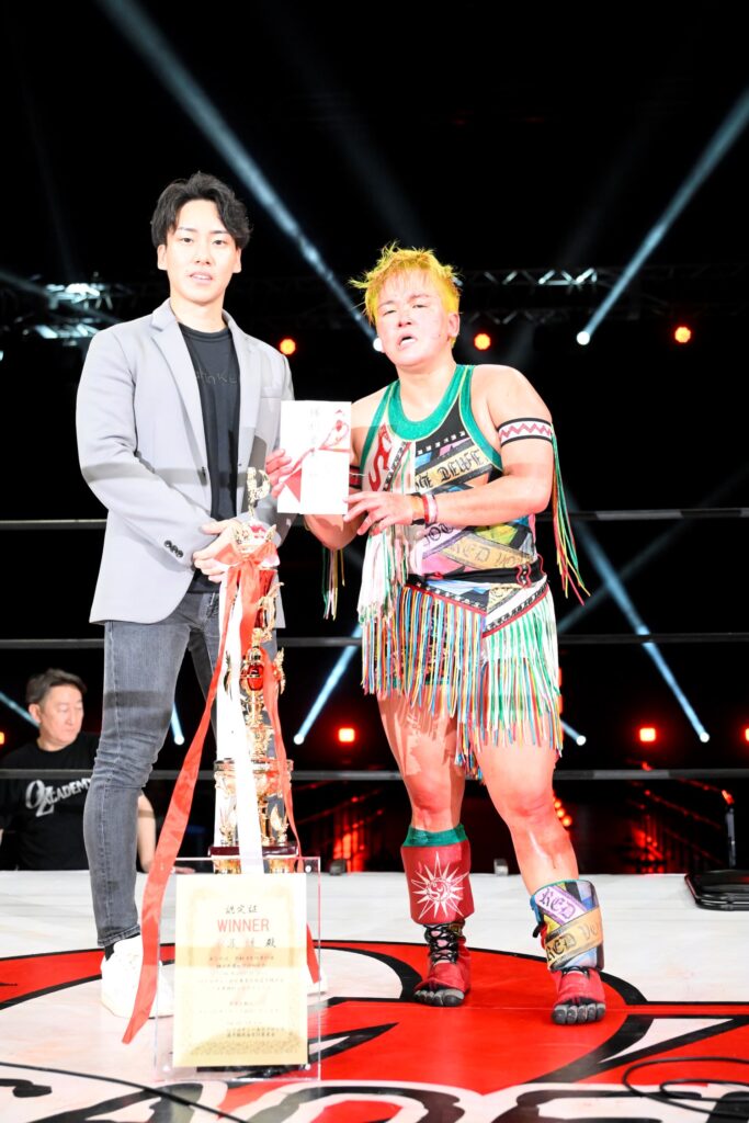 弊社 岩本取締役が、勝者・水波選手に勝利者賞を贈呈いたしました
